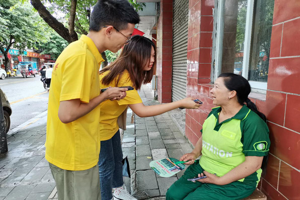 圖為實(shí)踐隊(duì)隊(duì)員采訪(fǎng)老城區(qū)環(huán)衛(wèi)工人