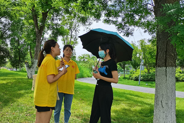 圖為實(shí)踐隊(duì)隊(duì)員采訪(fǎng)公園游客