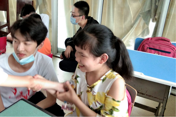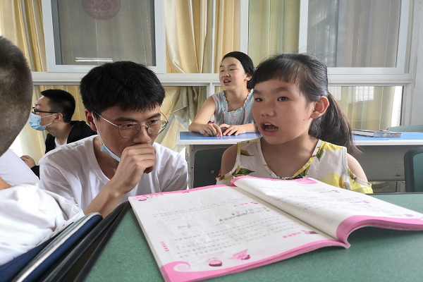 圖為實(shí)踐隊(duì)員在給孩子輔導(dǎo)作業(yè)