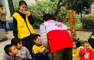 志愿者們與小朋友進行游戲 向日葵協會成員在給小朋友們分發游戲道具