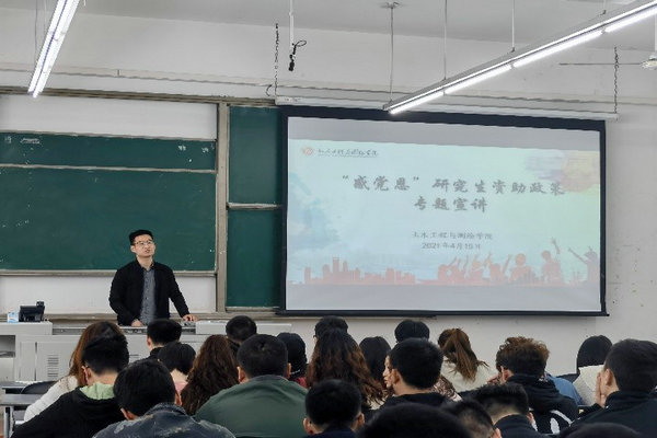 為著力發(fā)揮資助育人功效,貫徹落實(shí)高校研究生資助政策,在中國共產(chǎn)黨成立100周年之際有效引導(dǎo)研究生增強(qiáng)感恩意識(shí),2021年4月15日,土木工程與測(cè)繪學(xué)院“感恩黨”研究生資助政策專題宣講大會(huì)在明志樓A308教室召開,本次宣講活動(dòng)由研究生輔導(dǎo)員陳偉主持,土測(cè)院全體研究生參會(huì)。