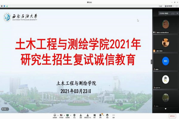 誠(chéng)信教育會(huì)議主要分為三部分:相關(guān)文件要求的講解、對(duì)考生要求的講解以及溫馨提示。首先,陳老師結(jié)合國(guó)家要求、相關(guān)文件以及違規(guī)處理辦法等強(qiáng)調(diào)了復(fù)試時(shí)誠(chéng)信應(yīng)試的重要性和必要性。然后給考生們?cè)敿?xì)講解了《西南石油大學(xué) 2021 年碩士研究生網(wǎng)絡(luò)遠(yuǎn)程復(fù)試考生誠(chéng)信承諾書(shū)》的填寫(xiě)以及要求。陳老師還就網(wǎng)絡(luò)復(fù)試時(shí)所需了解的注意事項(xiàng),結(jié)合《西南石油大學(xué) 2021 年碩士研究生網(wǎng)絡(luò)遠(yuǎn)程復(fù)試考場(chǎng)規(guī)則》中所規(guī)定的復(fù)試要求向考生做了詳細(xì)介紹,同時(shí)叮囑考生在復(fù)試期間不傳謠,不造謠,不信謠。