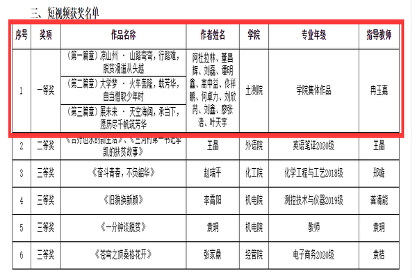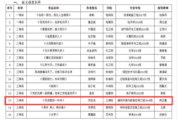 3月16日,西南石油大學(xué)黨委學(xué)生工作部公布了“助學(xué)?筑夢?鑄人”主題作品征集活動暨“說說”你身邊的脫貧故事評選結(jié)果,我院以“蘇施成長助跑計(jì)劃”中幫扶對象之一的阿杜拉林同學(xué)為主人公創(chuàng)作的“助學(xué)?筑夢?鑄人”系列作品獲短視頻類作品一等獎、《風(fēng)波里的一葉舟》獲征文類作品三等獎。