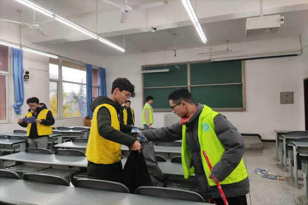 志愿者們到達我們此次主要的任務地點——明志樓三樓后,按照各自的分工,積極參與教學樓的清掃。在走廊上、教室里、轉角處,都可以看到志愿者們默默勞動的身影。他們有的拿著掃帚掃走地上的雜物,有的拿著垃圾袋收拾著掃出的垃圾,都在認真地打掃著各自負責的區域。有的則擦去講臺上的粉筆灰、彎腰拾起課桌里同學們忘記帶走的垃圾。清掃的整個過程安靜且迅速,盡量不打擾到任何一位在教室自習的同學,同時也為下一堂課的師生提供干凈舒適的環境。在樓下的志愿者們,則頂著寒風將自行車擺放整齊。他們一手把著車頭,一手托著車尾,將自行車放到正確的位置。