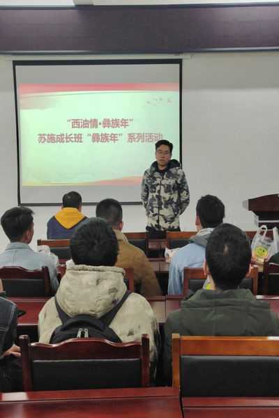 為進一步推進蘇施成長計劃的進行,切實深入彝區同學的學習生活,土木工程與測繪院于11月26日下午開展了“西油情·彝族年”蘇施成長班“彝族年”系列活動。輔導員孫明遠、劉欣芮、任遠航出席了本次活動。