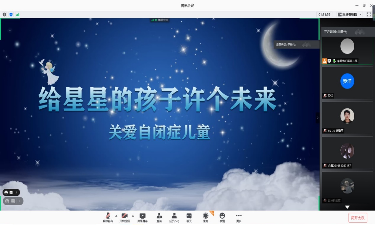 為讓參與志愿活動的同學們更好的走進他們的心靈、理解他們的想法,該線上活動向同學們介紹了自閉癥孩子的基本定義、常見的癥狀以及全國各地的發病率等等,讓同學們對這種陌生的疾病有了更多的了解。活動中我們向同學們播放了自閉癥公益短片《我叫豆豆》,使同學們以自閉癥患者的視角以及其家人的角度更加貼切的認識了這種癥狀。