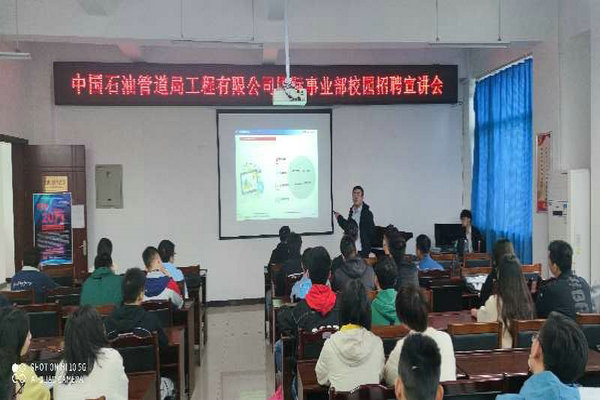 在宣講會(huì)上,首先由中國(guó)石油管道局工程有限公司國(guó)際事業(yè)部的校園招聘人員播放了本次招聘短視頻,包括公司簡(jiǎn)介、員工感想和員工生活剪輯。然后,公司負(fù)責(zé)人向同學(xué)們較為詳細(xì)的介紹了公司的構(gòu)架、人員情況、合作伙伴、在建項(xiàng)目、工作環(huán)境、生活環(huán)境和新員工成長(zhǎng)。接下來(lái),公司負(fù)責(zé)人向同學(xué)們介紹了關(guān)于公司的職業(yè)發(fā)展情況、國(guó)際化平臺(tái)和核心競(jìng)爭(zhēng)力。本次招聘入職人員的工作地點(diǎn)為國(guó)外公司。隨后,在提問(wèn)環(huán)節(jié)中,現(xiàn)場(chǎng)畢業(yè)生踴躍提問(wèn),大家對(duì)國(guó)外的生活、薪資、入職簽約方式等提出問(wèn)題,在場(chǎng)公司負(fù)責(zé)人也對(duì)同學(xué)們提出的問(wèn)題認(rèn)真解答。