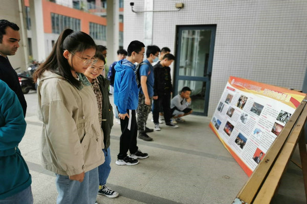 隨后,學生代表前往明志樓一樓大廳,學習主題展板“四十二載改革路,新時代中創輝煌”。對于“1978改革開放的提出,2013年習近平總書記提出‘一帶一路’倡議”、“北斗導航衛星系統,5G技術,港珠澳大橋”等相關主題展板,同學們展開了熱烈的討論。同時同學們對展板上所展現的中國成就感到十分驕傲與自豪。