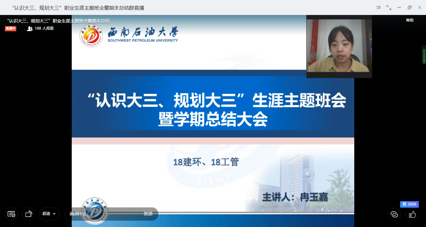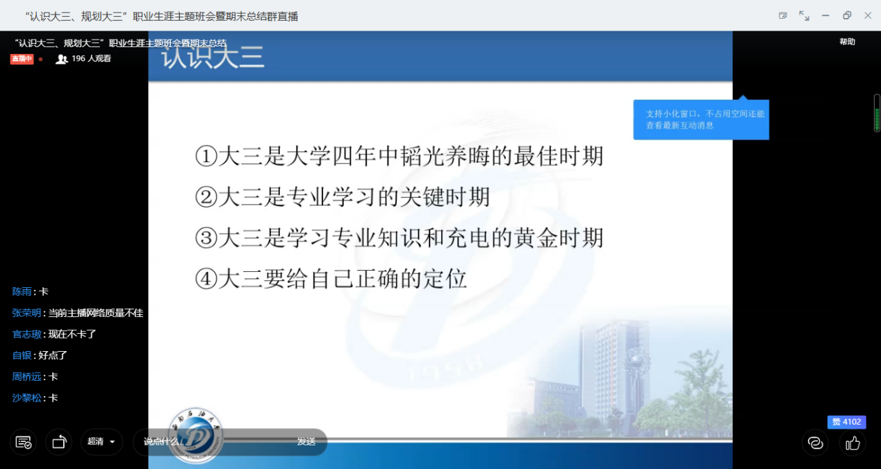 7月6日,土測院2018級工管、建環專業“認識大三,規劃大三”生涯主題班會暨學期總結班會在釘釘順利召開,本次班會由輔導員冉玉嘉主持,2018級工管、建環專業學生全體到會。