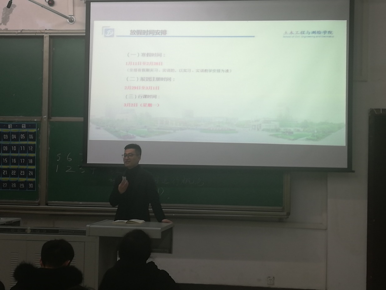 1月2日晚上19:00,土木工程與測繪學院研究生2019年秋季學期期末班會在明辨樓C205教室召開,輔導員陳偉老師組織召開了本次班會。