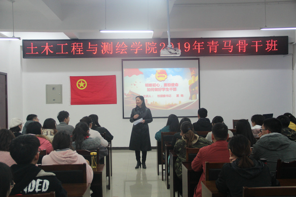 為深入學(xué)習(xí)貫徹黨的十九大精神和團(tuán)的十八大精神,教育引導(dǎo)廣大青年學(xué)生自覺(jué)成為適應(yīng)和引領(lǐng)國(guó)家發(fā)展、擔(dān)當(dāng)民族復(fù)興大任的時(shí)代新人,11月22日,土測(cè)院在明志樓A413開(kāi)展了“青馬骨干班”培訓(xùn)第一講。此次課程由校團(tuán)委書記夏艷授課,參與本次活動(dòng)的有土測(cè)院團(tuán)委副書記何雨洋,輔導(dǎo)員吳放、孫明遠(yuǎn)、冉玉嘉、鄭文磊以及土測(cè)院80余名學(xué)生干部。