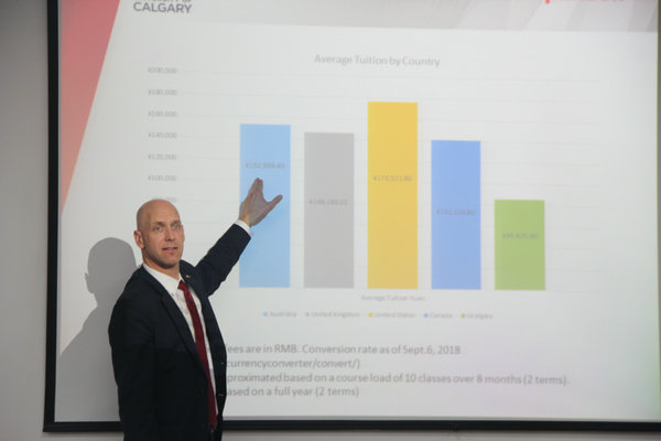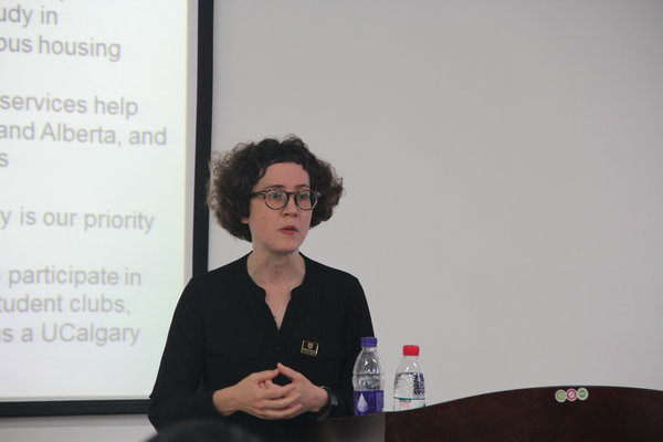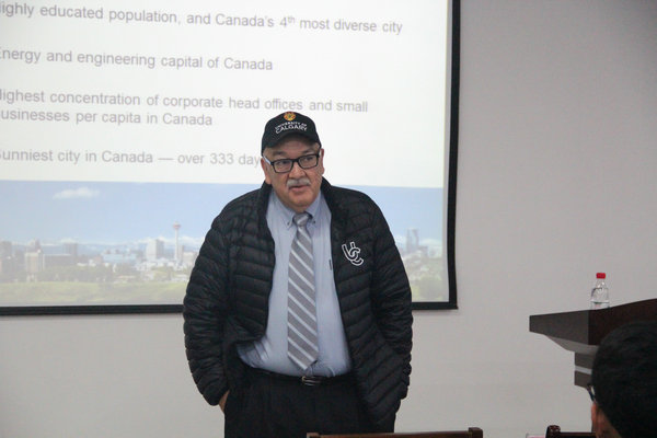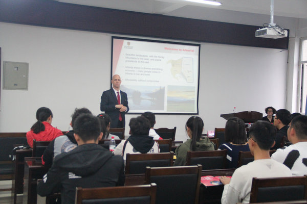 宣講會上,Calvin首先向大家介紹了加拿大的地理位置和風土人情,并通過一些實例向同學們描述了加拿大地廣人稀的現狀。隨后,Calvin從經濟結構、稅收、地理位置以及生態環境這幾個方面介紹了卡爾加里市。在同學們對卡爾加里有了初步的了解后,Peter通過PPT、視頻和具體的數據向同學們介紹了卡爾加里大學學校排名、重點專業、科研經費、留學生數量等方面的情況,參會同學對卡爾加里大學留下了良好的印象。