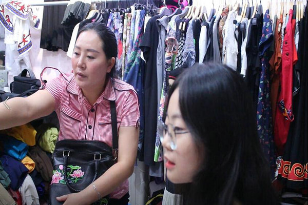 清晨廊橋之上已是人來人往,于是實踐隊決定先從廊橋開始調(diào)研。廊橋是馬邊有名的建筑之一,紅黑搭配的色調(diào)很有中國風,就像一條紐帶,橫亙在馬邊河之上。隊員們來到了廊橋之上的一家彝族婚紗服裝店并對其進行了深度的采訪調(diào)研。采訪得知,店里的服裝全由手工制作,形式眾多,且男女服飾的穿戴有明顯的區(qū)別,帶有濃厚的地域色彩。但由于地域氣候原因,彝族服飾季節(jié)性不強,只有在“火把節(jié)”等一些歡慶節(jié)日才會出現(xiàn)舉城皆為彝族服裝的場景。