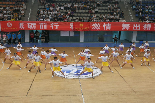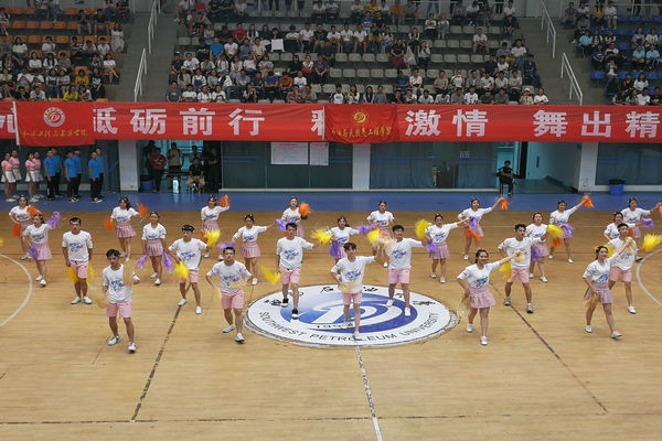 隨著觀眾席的掌聲響起,土建院的隊員們身著白色T恤和粉色短褲登上舞臺。音樂響起后,隊員們迅速分開站好隊型,他們的舞蹈表演正式開始。旋轉(zhuǎn),跳躍,青春的氣息隨著整齊劃一的動作蔓延到整個體育館。舞蹈進行到一半,隊員們解開腰間的拉花,并隨著音樂揮動。緊接著,他們又進行了一次精彩的隊形變換:在場地兩邊盡情翻騰,把現(xiàn)場塑造成了一片青春的海洋。舞蹈最后,隊員們齊聲喊出“甲子榮光,成興油夢;百年宏愿,鑄雙一流”的口號,點燃了現(xiàn)場氣氛,將比賽推向了高潮。最終,土建院榮獲三等獎。