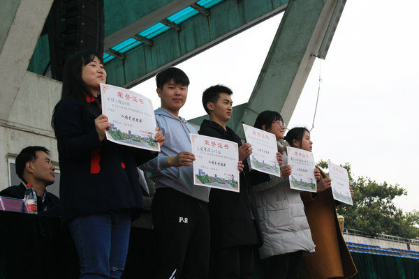 閉幕式開始首先進行的是頒獎儀式。擔任主持人的輔導員周配公布了團體總分排名:17建環代表隊、17土木代表隊和17工管代表隊分別獲得第一、第二和第三。15測繪方隊、15工管方隊、16建環方隊、16測繪方隊和17建環方隊獲得入場式優勝獎。此外,儀式上還頒發了體育道德風尚獎。
