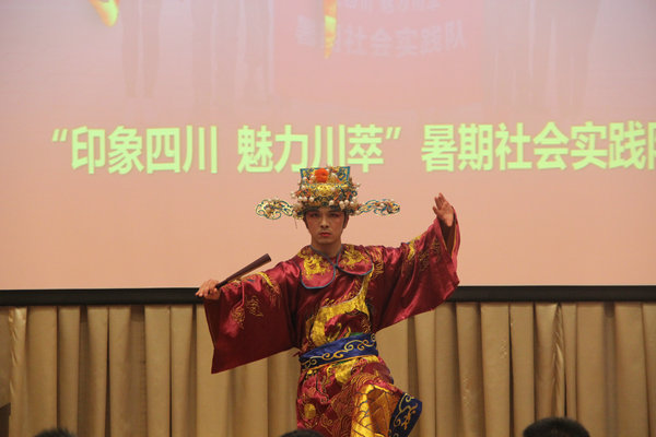 在答辯人周之圓簡單開場后,“印象四川,魅力川萃”隊的成果展示正式開始。伴隨著解說詞的變換,隊員們依次展示了他們在川茶、川菜、川劇,蜀繡等四川傳統文化中的實踐成果。與此同時,他們還進行了沖泡川茶、川劇變臉等相應表演,使得整個答辯展示引人注目。此外,羌族文化、紅色文化也是實踐隊的展示重點。他們在實踐中深入北川,傳播羌族文化;前往建川博物館,探索紅色精神,深深引起了在座觀眾的深深共鳴。