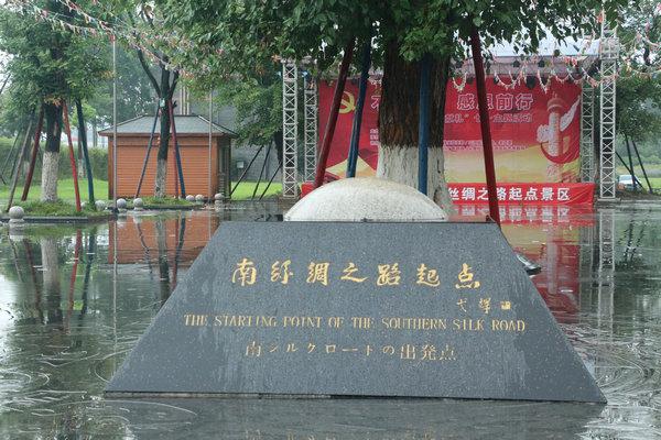 繞過聚合各類民間藝術制品、傳統工藝文化的手工記憶一條街,實踐隊員們前往了絲綢文化主題公園。這個主題公園是以絲綢文化為主題,以蠶桑絲綢的文化演繹為景觀軸線打造的園林景觀,其通過栽桑養蠶互動、繅絲織綢互動、蜀錦蜀繡體驗等給游客呈現全新的互動游玩體驗。盡管飄著小雨,沒能親身體驗互動,但隊員們仍從其充滿絲綢文化的氣息中體會到了濃濃的傳統情懷。
