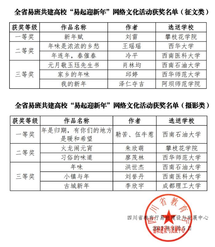 “易起迎新年”網絡文化活動的參賽作品經高校推薦,四川省教育廳易班建設與發展中心組織專家對所有參賽作品進行評審,并最終結合網絡投票評選出一等獎3項、二等獎6項、三等獎9項。旨在豐富學生寒假生活,弘揚中華優秀傳統文化,激發熱愛祖國、熱愛家鄉的情懷,進一步增進共建高校師生間的交流。