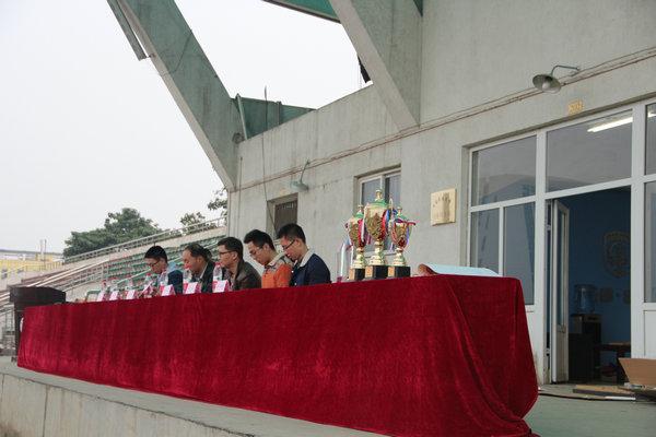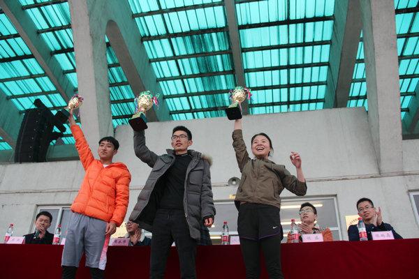 在各專業方隊入場后,閉幕式正式開始。周配老師公布了本次院運會團體總分的排名:14土木代表隊、16測繪代表隊和15測繪代表隊分別得到第一、第二和第三。土建院黨委副書記姚遠和土建院團委書記周永華為這三支代表隊頒發了獎杯。此外,閉幕式上還頒發了體育道德風尚獎和20*50接力賽前三名。