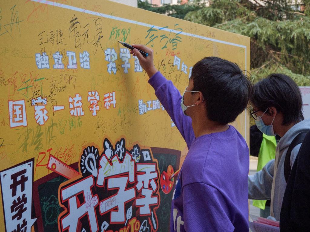 新生們來到拼圖墻前,每人選擇一塊自己的小方塊,輕輕地貼在對應的編號上,寓意著他們為土測院的未來建設和發展貼磚加瓦,貢獻屬于自己的一份力量,同時彰顯了團結一致,相互協作的精神。接著,在活動現場志愿者的引導下來到簽名墻,用簽名筆在簽名墻上留下自己的名字,并拍照留念。在簽名墻旁邊擺放了一個打卡拍照的相框,上面寫著“一級夢想建造師”,同學們可以在此進行打卡拍照留念。