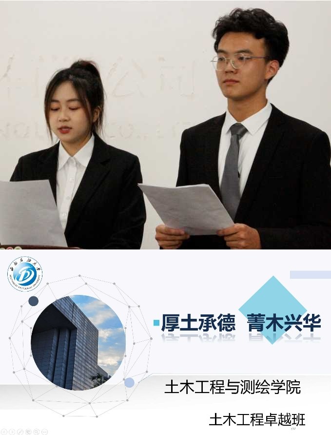 土木工程卓越班一上臺便顯示了昂揚的精神風貌。齊心向黨,積極開展政治思想文化學習;潛心向學,組織小組學習,班級同學取得高績點,彰顯出良好的學風和班風;守正創(chuàng)新,創(chuàng)立班級網站,在各類比賽中斬獲各類獎項和證書;眾志成城,參加志愿服務活動,全班志愿服務總時長超5000小時。“一葦以航折逆旅,同舟筑夢卓越班”!