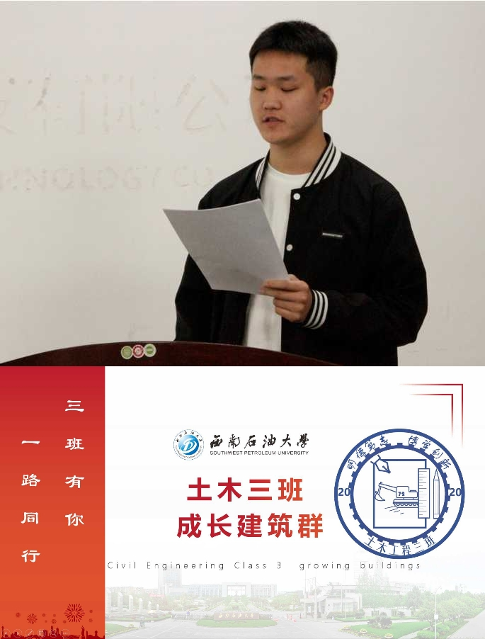 接下來,2020級工程管理一班從黨團建設、學術能力、全面發(fā)展、班風建設四個方面展開答辯。2020級工程管理一班的同學們積極參與團活動,班集體榮獲“2021年優(yōu)秀團支部”稱號;高績點、各類比賽獎項展現出優(yōu)秀的學術能力;同學們踴躍參加活動,班級全面發(fā)展;樹立信念,營造了良好班風。“永遠在前進的路上!”道出2020級工程管理一班的奮進與拼搏。