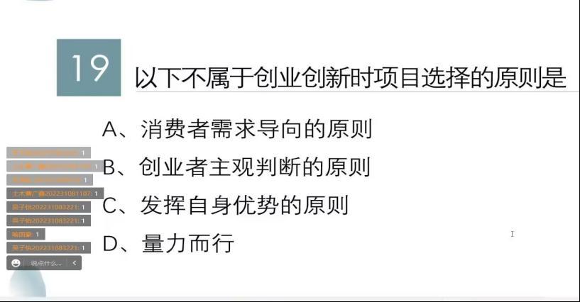 比賽過程十分熱鬧,同學們秉持著“友誼第一,比賽第二”的原則積極競答,完成后由主持人尚菲菲對答案進行耐心地解釋,讓每個同學都能在學習創新創業相關知識的同時感受到學長學姐對于22級新同學們的照顧。由于同學們對本場線上活動的踴躍參加,參與人數達到了120人之多。在眾多同學的熱情參于下,原定為75分鐘的賽程在40分鐘內完成,最后于3點50分圓滿結束,許多同學仍意猶未盡。