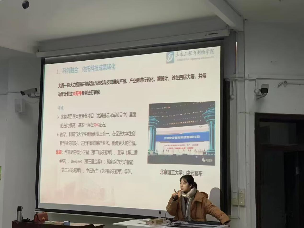 12月3日下午,由土測院大學生創(chuàng)新創(chuàng)業(yè)俱樂部在明志樓A308舉行的“挑戰(zhàn)杯”大賽專題講座圓滿結(jié)束。為進一步深化與激發(fā)我院學生對“挑戰(zhàn)杯”大學生創(chuàng)業(yè)計劃競賽的興趣,激勵廣大學生敢于創(chuàng)新、積極奮進,我院冉玉嘉老師舉辦了以挑戰(zhàn)杯比賽為主題的培訓講座。