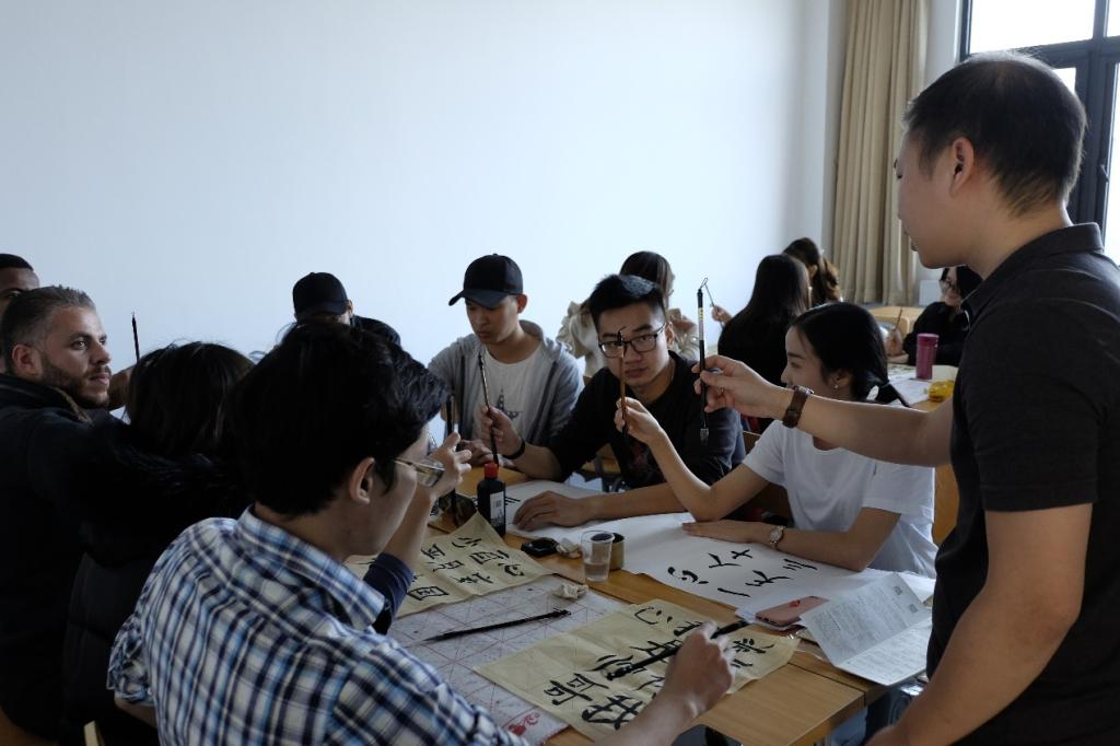 書法,作為漢字的藝術表現形式,是中華文化最直接的載體,同時又蘊含著深刻的中國傳統哲學思想。通過書法協會中國學生代表的講解,留學生們了解了中國書法藝術的歷史起源和演變、主流門派和文化內涵。詳細的講解使留學生對中國書法有了初步的認知。接著,書法協會中國學生代表對書法用到的文房四寶——筆、墨、紙、硯進行逐一講解,指導學生正確的執筆方法、書寫姿勢和書寫章法,并展示了不同字體的書法作品。在專業指導下,留學生們嘗試著提筆書寫簡單的毛筆字,并很快掌握要領,逐漸能夠連貫地寫出漢字。活動后留學生不僅深深為中國書法深厚的文化底蘊所吸引,而且還在淡淡墨香和行云流水間對中國書法產生了濃厚的興趣。