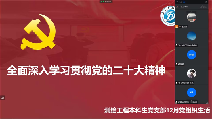 2022年12月1日,西南石油大學土木工程與測繪學院測繪工程本科生黨支部召開了關于學習貫徹“黨的二十大精神”的線上黨組織活動?;顒泳o緊圍繞習近平總書記在大會上的重要發言展開了論述。
