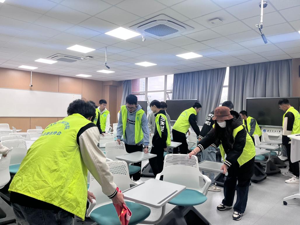 下午五點,參與活動的志愿者們準時到達明志樓A區樓下集合,在項目成員安排下進行一系列的簽到。簽到完畢后,活動負責人先拍照合影留戀,然后向大家講解了工作內容以及清掃范圍。隨后將活動人員分為兩組。一組負責清掃明志樓A區教室和擺放桌椅,另一組負責清掃明志樓B區教室并收拾好垃圾。隨后,大家領取了工具并有條不紊的開始了各自的工作。志愿者們積極的擺放著明志樓教室的桌椅,并仔細的清理了地面、課桌以及抽屜里的垃圾,高效地開展著志愿工作。在大家的努力之下,教室恢復了之前干凈整潔的樣貌?;顒咏Y束之后,項目組成員整理并清點了活動工具和馬甲并歸還到了原處。