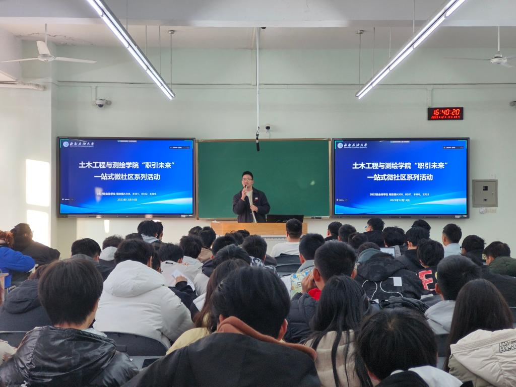 為全面落實學校“一站式”學生社區建設,扎實推進學院“一站式”學生微社區工作,2023年12月14日,土木工程與測繪學院2022級全體學生在明志樓A308、B301-B303教室參加主題為“職引未來,職業規劃與就業指導”一站式微社區系列活動。本次活動聚焦學生成長成才,為學生職業規劃提供指導和引領,幫助學生深入了解自身,明確職業方向和目標,引導學生提前做好職業規劃,提升其在未來就業市場中的競爭力。