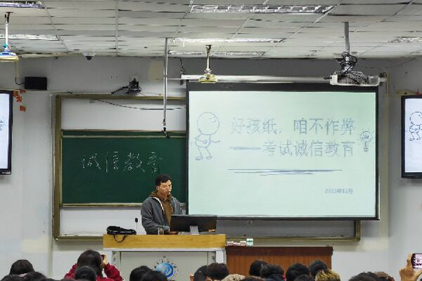 江林以一則警示教育片引出主題,指出誠信是考試的基本要求,并結合學生手冊強調了學校對考試作弊的處理措施。針對于即將來臨的大學英語四六級考試,江林做出特別提醒,英語四六級考試屬于國家級考試,一旦作弊將面臨刑事責任,警誡學生誠信參考,不要作弊,杜絕僥幸心理。最后,江林強調,出手作弊必被抓,不論是期末還是四六級考試,都要自覺遵守考試紀律,靠真實水平取得好成績。