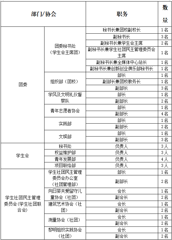 為進一步落實《關于推動高校學生會(研究生會)深化改革的若干意見》的通知精神及《高校學生社團建設管理辦法》相關要求,基于團學工作的實際需要,各組織及崗位有所調整(具體崗位設置請見下表)。同時為促進我院團委、學生會、全媒體中心、大學生創新創業俱樂部、招生就業服務部、學生社團民主管理委員會等各項工作順利進行,保持工作開展的連續性,更好地為同學們服務,現正式啟動土木工程與測繪學院第22屆團委、學生會、全媒體中心、大學生創新創業俱樂部、招生就業服務部、學生社團民主管理委員會學生干部選聘工作,具體事宜通知如下: