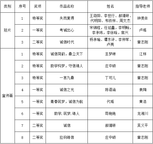 根據學校《關于開展我校2024年誠信教育宣傳作品征集活動的通知》要求,我院開展了院級評選活動,遴選優秀作品參加校級評選。經同學們投稿,學院評審,現將評選結果公示如下: