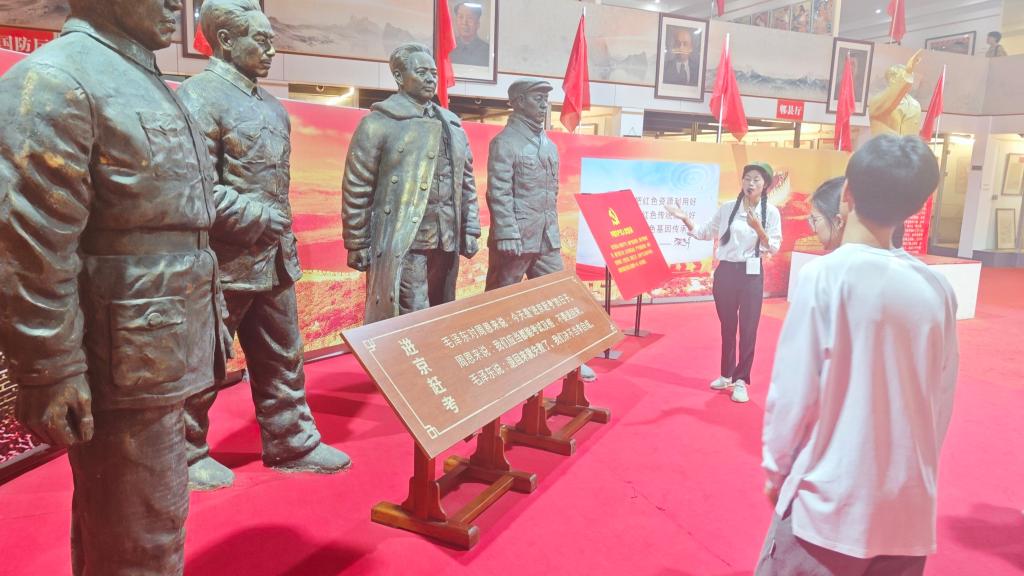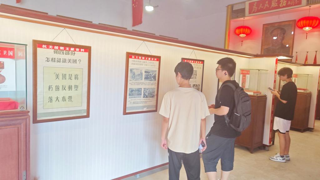 隊伍進入的一號展廳存有一座紅船雕塑,象征著紅船精神,展現了中國共產黨的光輝歷程。在二號廳陳列的文物展現了中國共產黨對中國走向強盛的卓越貢獻。三號展廳展現了如邱少云、楊連弟、楊根思等無數英雄在抗美援朝戰場上奮勇殺敵、保家衛國的英雄事跡,展廳中的水壺、槍支等展品反應出志愿軍在朝鮮戰場上艱苦的作戰條件,彰顯了中國人民志愿軍偉大的愛國主義精神與熱愛和平的信念。四號農耕文化展區展現了人民百姓在近代中國生活狀況的改變與發展。