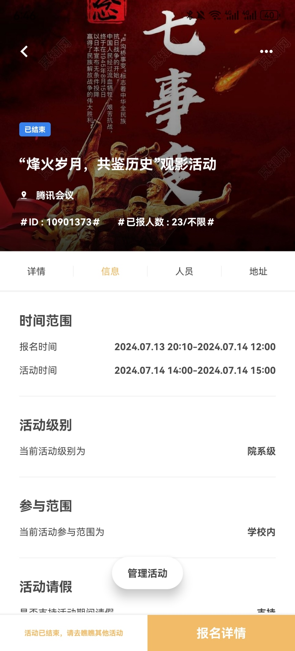 為紀念“七七事變”爆發87周年,警醒同學們勿忘國恥,振興中華。西南石油大學土木工程與測繪學院全媒體中心于7月14日在騰訊會議開展“烽火歲月,共鑒歷史”主題觀影活動。本次活動借助易班輕應用進行報名,活動一經發布便收到了很多同學的青睞,大家紛紛踴躍報名參與了此次活動。另外,對于此次活動我們還申請了到夢空間作為活動的獎勵,以此才激勵更多的同學參與到我們的活動中來。