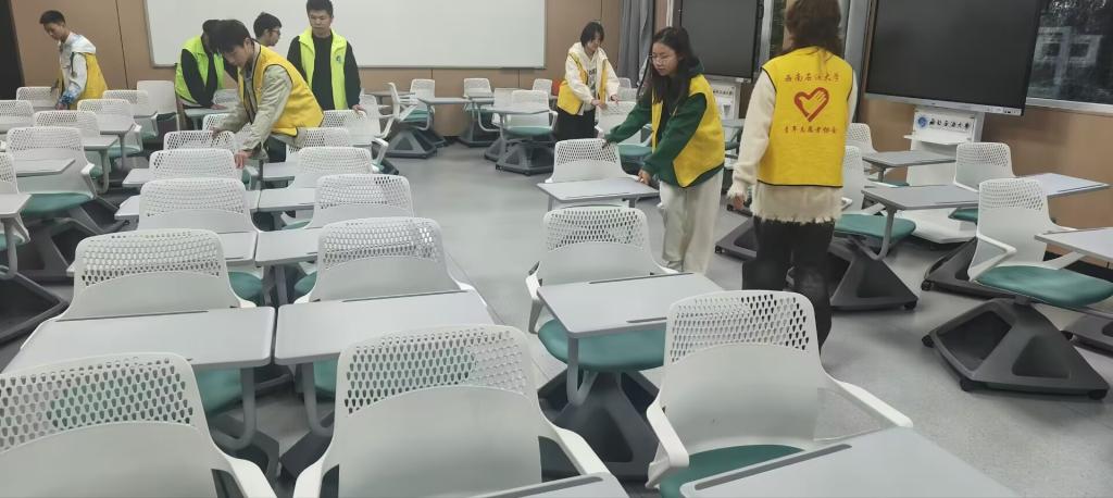 志愿者們在整理桌椅