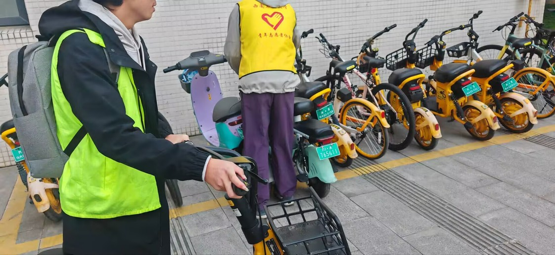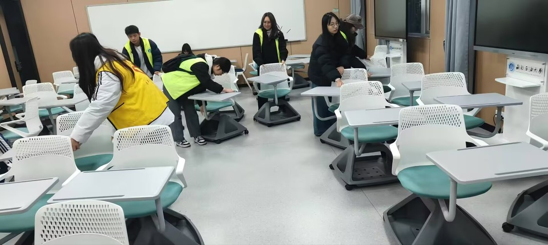 活動期間,同學們分工明確,密切協(xié)作。有的同學手持掃帚,認真清掃樓道和教室內(nèi)的垃圾與灰塵,不放過任何一個角落,那專注的神情仿佛在雕琢一件珍貴的藝術品;有的同學負責整理教室桌椅,將它們擺放得整齊有序,伴隨著清脆的挪動聲,桌椅迅速歸位;還有部分同學在明志樓周邊對車輛停放進行了規(guī)范整理,引導師生們將自行車、電動車整齊停放在指定區(qū)域,響亮的提示聲讓校園交通更為有序。在清理一間教室時,志愿者們發(fā)現(xiàn)了一些長期無人認領的雜物,他們仔細分類整理,將有價值的物品登記后交由學校相關部門處理,無用的則清理干凈,讓教室煥然一新。