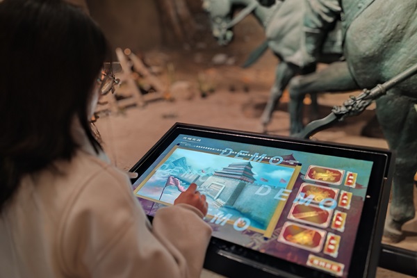 支部成員使用博物館內(nèi)數(shù)字展覽設(shè)備感受戰(zhàn)國(guó)場(chǎng)景