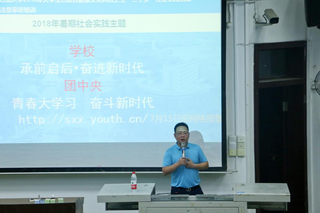 7月3日晚七點,校團委于思學樓B210舉行2018年暑期文化科技衛生“三下鄉”社會實踐活動校級團隊動員大會。校醫院老師廖香瓊,黨委宣傳部老師李陽,校團委副書記張維,校團委老師溫登峰出席現場為校級團隊成員進行社會實踐相關事宜培訓。
