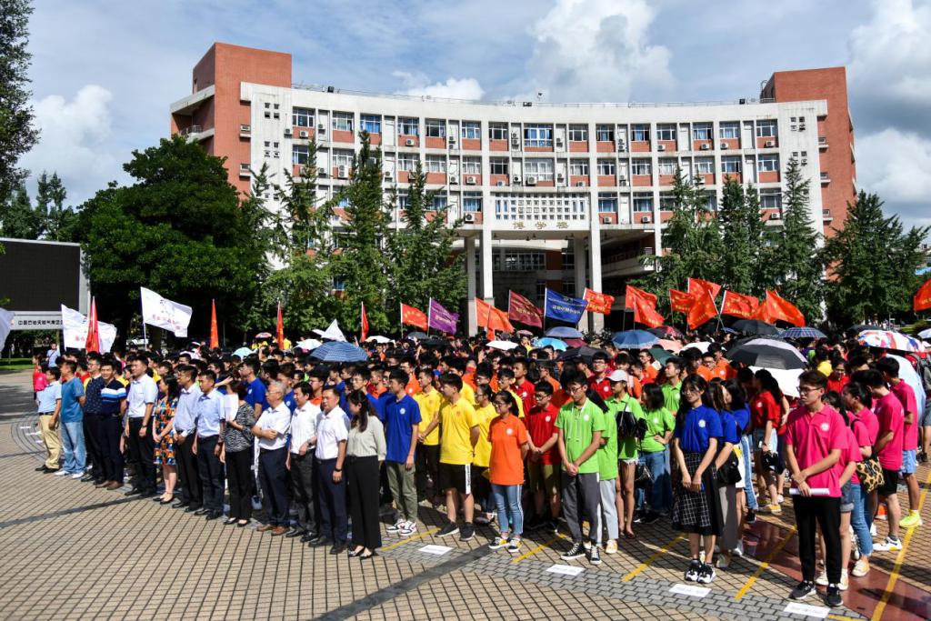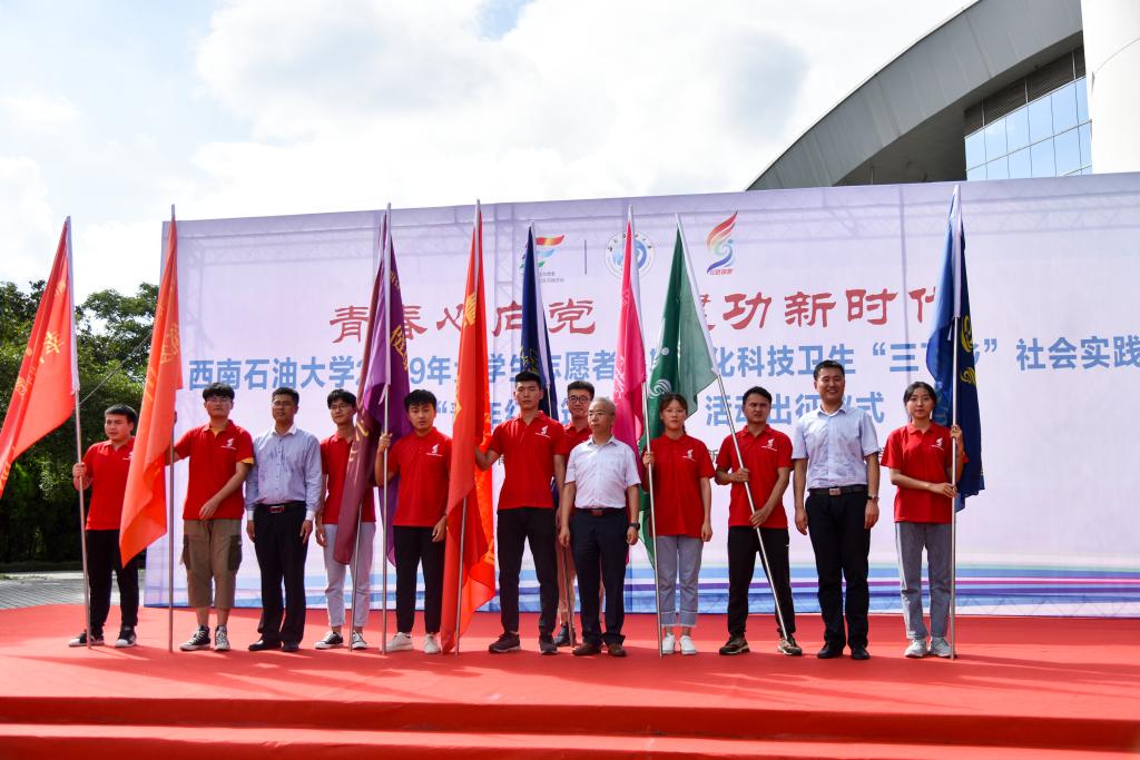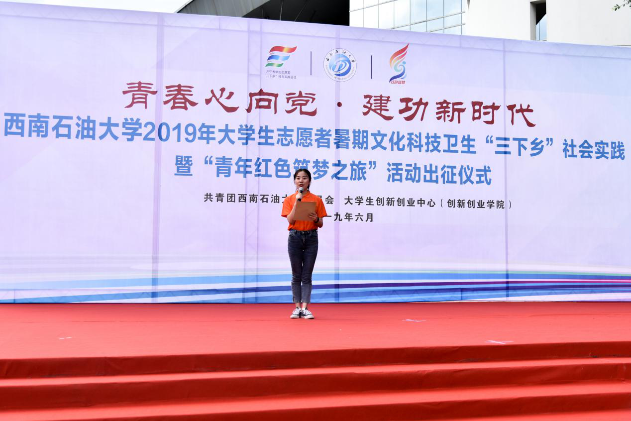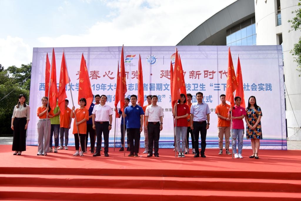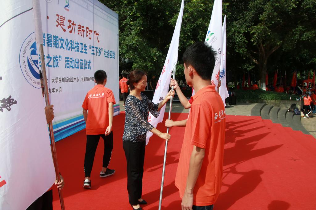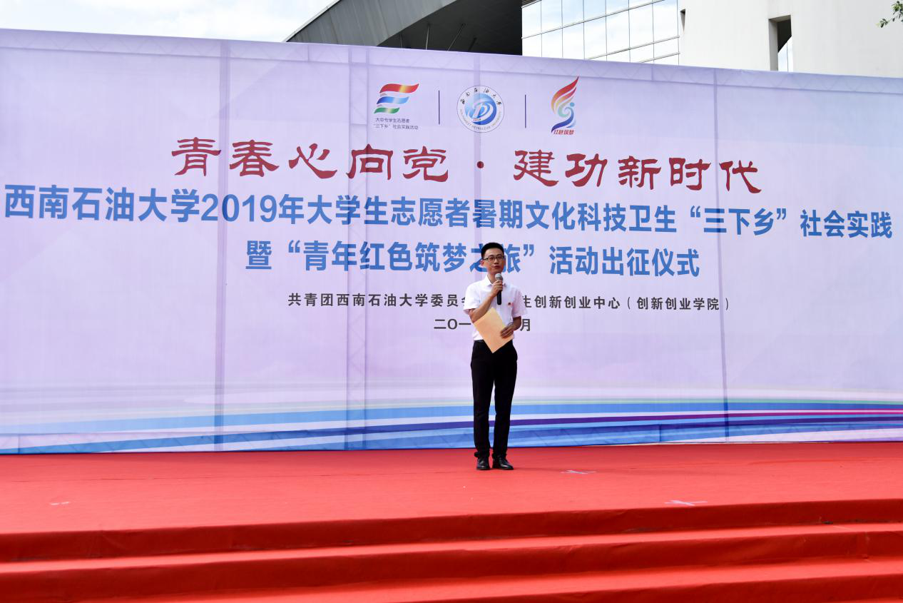 6月27日下午,我校2019年大學生志愿者暑期文化科技衛(wèi)生“三下鄉(xiāng)”社會實踐暨“青年紅色筑夢之旅”活動出征儀式在博學廣場舉行。學校黨委常委、副校長劉向君,宣傳部副部長曹正,學生工作部部長蒲勇,教務處處長黃健全,招生就業(yè)處處長張敏,大學生創(chuàng)新創(chuàng)業(yè)中心主任姚遠,心理發(fā)展與服務中心主任方可,馬克思主義學院院長張小飛,校團委書記夏艷及各學院黨委副書記、團委書記和青年志愿者代表出席出征儀式。