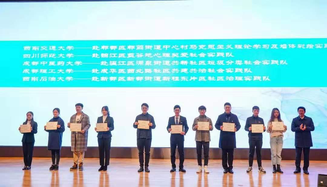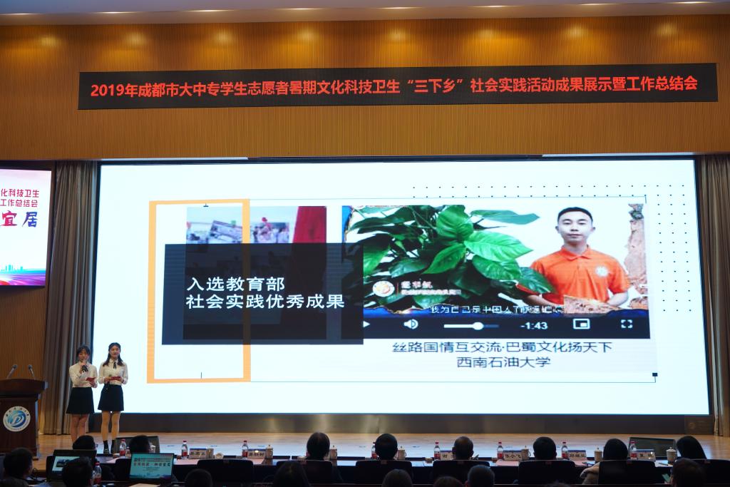 來自西南石油大學(xué)、西南交通大學(xué)、成都工業(yè)學(xué)院、成都大學(xué)等12所高校的實(shí)踐隊(duì)進(jìn)行了成果展示,他們通過文字、圖片、視頻、實(shí)物等形式介紹了同學(xué)們助力鄉(xiāng)村建設(shè)、社區(qū)治理、特殊群體心理援助、禁毒防艾、生活垃圾分類、科學(xué)普及、扶危濟(jì)困、中外文化交流等方面的經(jīng)驗(yàn)和成果。
