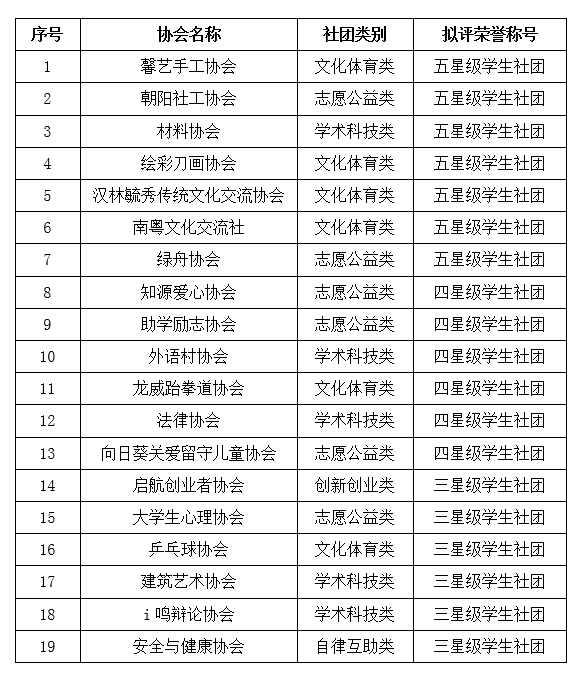 根據《關于開展西南石油大學2020—2021學年星級品牌社團創建活動的通知》要求,團委通過決賽答辯和校園影響力調查綜合評定,擬對馨藝手工協會等19個學生社團授予2020—2021學年星級品牌社團榮譽稱號,現將結果予以公示: