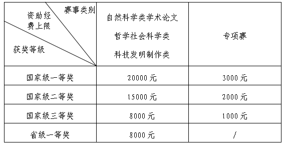 3.本次“挑戰杯”校內選拔賽參賽作品的立項資助以成果為導向,資助獲得省級一等獎及以上獎項的優秀作品。按照審批的作品經費預算(經費預算表見附件4,在資助經費上限和學校財務報銷規定的范圍內,資助經費實行實報實銷原則。不同類別、不同獎項的資助經費上限見表2。