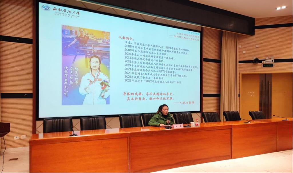 講座開始,向劍鋒首先向同學們介紹了王睿的基本情況,隨后,王睿進行了成長經歷分享。汶川大地震中被預制板砸中雙腿導致截肢,但她并沒有向命運屈服,在家庭的鼓勵下加入成都市殘疾人乒乓球隊。從零開始的王睿每天揮拍八個小時,日復一日的艱苦訓練,很快讓她在賽場上嶄露頭角,在東京殘奧會、杭州亞殘運會等國際賽事中斬獲金牌,在最高領獎臺上舉起了五星紅旗,圓了自己的奧運冠軍夢。王睿講道:“乒乓球給了我第二次生命。我想告訴同學們,每個人都有自己的弱點,我們要鼓起勇氣,面對它們,和它們一起成長?!?/span>