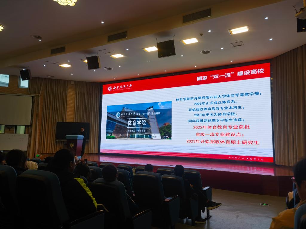 會上,汪佳材進行招生宣講及學科推介,向全體同學發(fā)放招生宣傳手冊,結(jié)合體育學院的辦學概況、師資隊伍及教學科研成果、運動場所與教學設(shè)施、體育競賽及學生風采進行詳細闡述,詳細介紹學校學院辦學歷史、良好人文環(huán)境、優(yōu)秀師資隊伍、“雙一流”建設(shè)突出成就、人才培養(yǎng)體系特色、學科和專業(yè)優(yōu)勢、就業(yè)去向和校友成就等情況,得到現(xiàn)場家長和學生的一致認可。