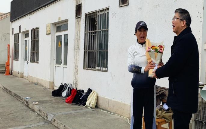 上午10點,學院黨委書記彭小華、副院長石金亮分別帶隊,手捧鮮花,來到田徑場、網球場和羽毛球場等體育課場地。他們逐一慰問正在進行教學和訓練活動的女教職工,向她們送上鮮花,并致以誠摯的節日問候。女老師們對學院的慰問感到非常驚喜,紛紛表示這次送花活動讓她們感受到了學院的關懷和尊重。現場同學們紛紛鼓掌,向老師表達祝福。