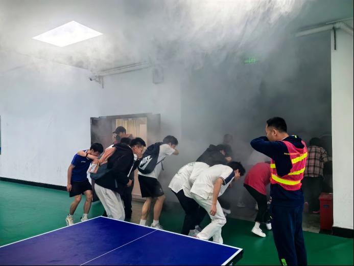 在隨后的消防疏散演習中,模擬體育館突發火情,濃煙四起,正在館內上課的師生,在消防引導員的指揮下,有序安全撤離至室外空地,疏散演習取得圓滿成功。