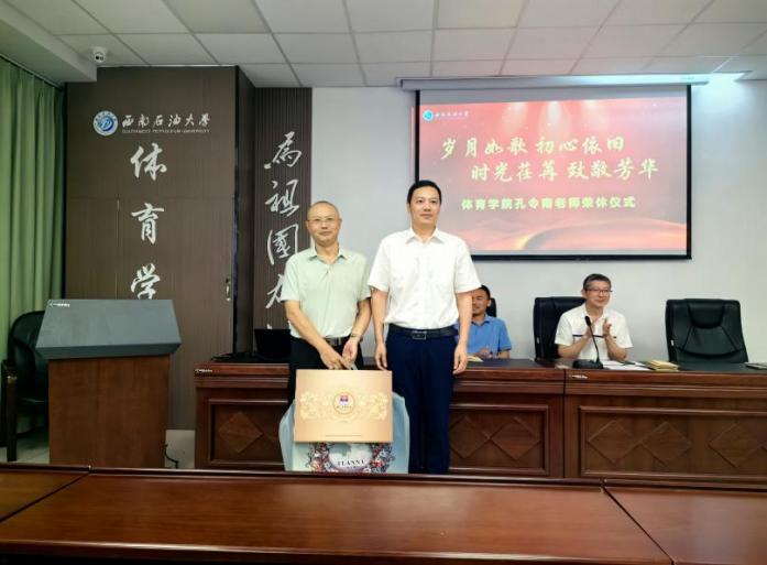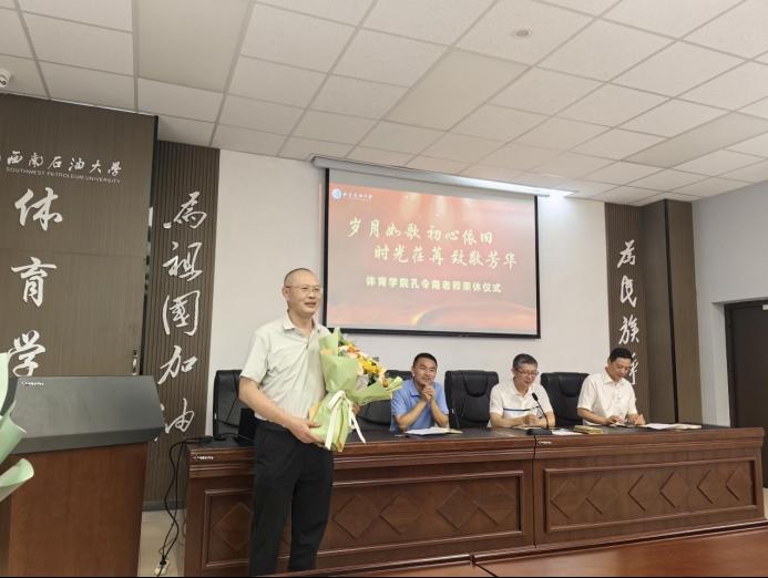 儀式伊始,彭小華在致辭中熱情洋溢的指出,此次榮休儀式旨在傳承和弘揚(yáng)學(xué)校尊師重教的優(yōu)良傳統(tǒng),并向?yàn)榻逃聵I(yè)奉獻(xiàn)了43載春秋的孔令南老師表達(dá)崇高的敬意和深深的祝福。隨后,孔令南老師感人至深地說(shuō)到,能夠?yàn)閷W(xué)校的發(fā)展貢獻(xiàn)自己的力量,他感到無(wú)比驕傲和自豪。同時(shí)他表示退休并非終點(diǎn),而是人生新篇章的開(kāi)始。緊接著,彭小華代表學(xué)院向孔令南頒發(fā)了榮譽(yù)獎(jiǎng)杯,向劍鋒向孔老師頒贈(zèng)了綬帶并獻(xiàn)上鮮花,石金亮向孔老師贈(zèng)送了榮休慰問(wèn)品。三位院領(lǐng)導(dǎo)向孔老師表達(dá)了親切的問(wèn)候和誠(chéng)摯的祝愿。在儀式的高潮部分,青年教師盧磊代表全體青年教師為孔老師獻(xiàn)上了鮮花,并表達(dá)了傳承老教師優(yōu)良傳統(tǒng),做好新時(shí)代體育教育工作的決心。